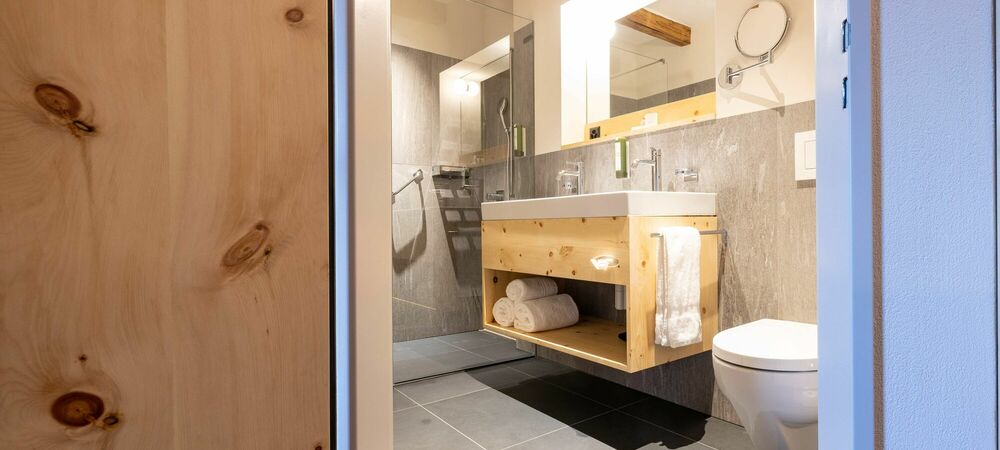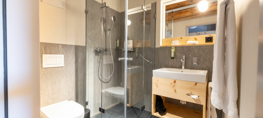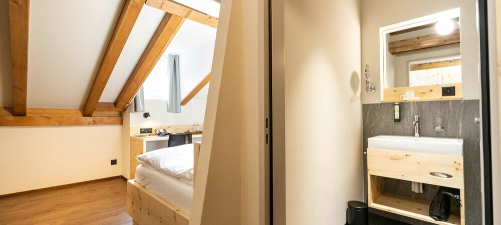 Our new Palantschin rooms are furnished with Swiss pine and Vals stone.