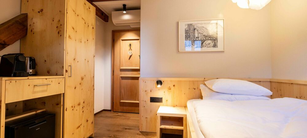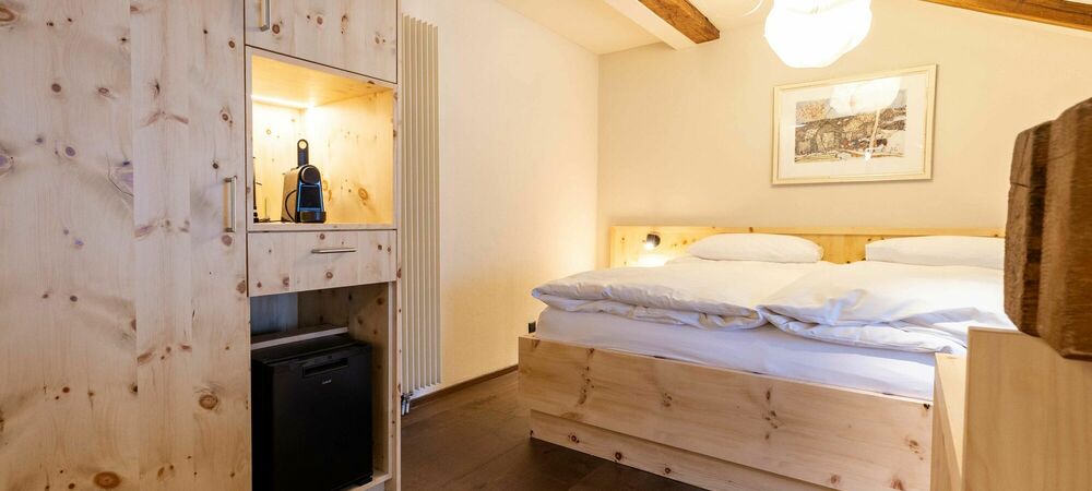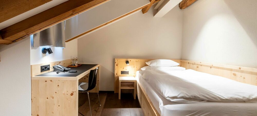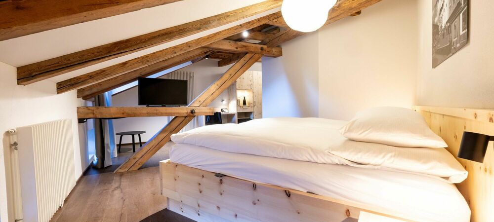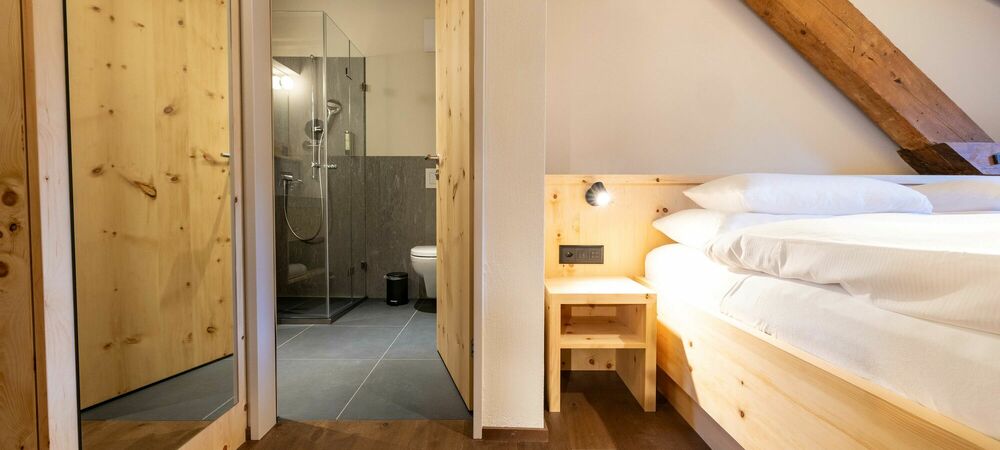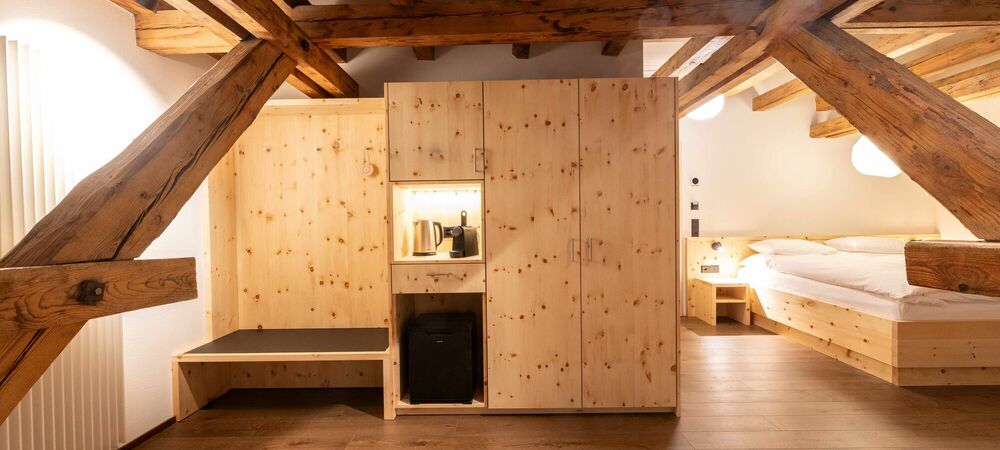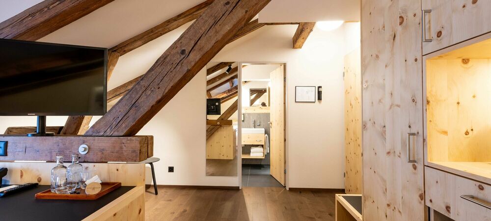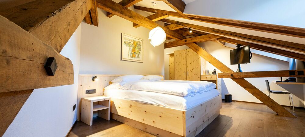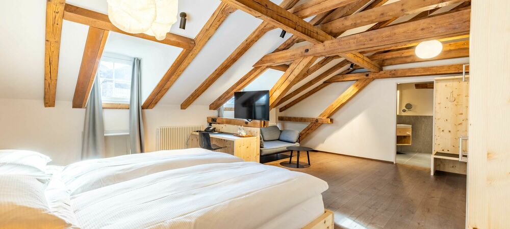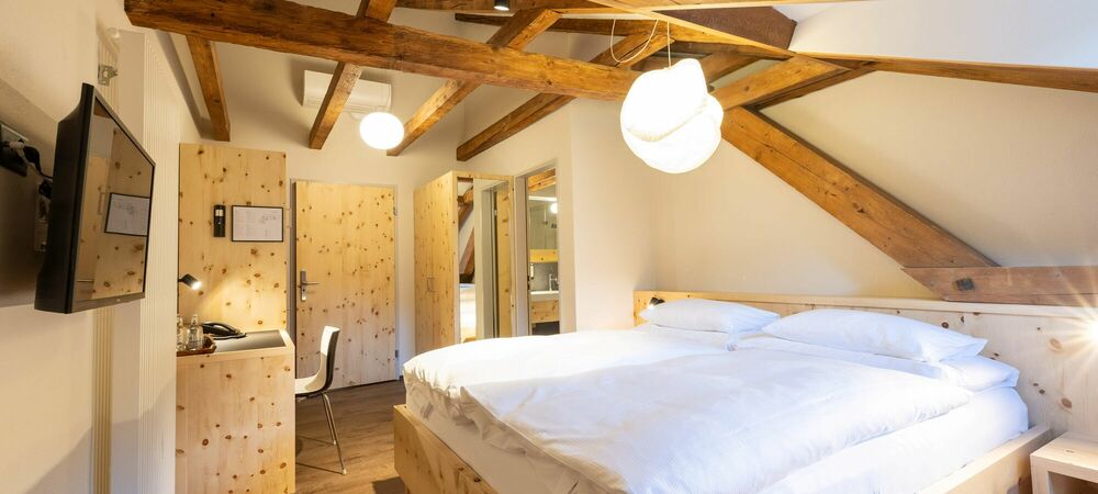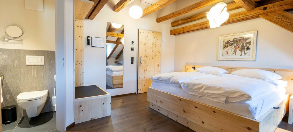 Tradition. Modernity. Grisons style. Our new Palantschin rooms are furnished with Swiss pine and Vals stone.