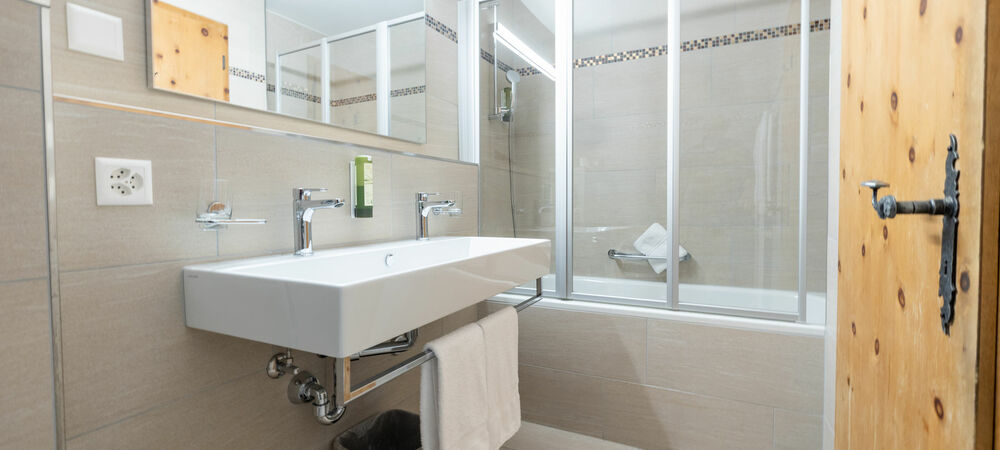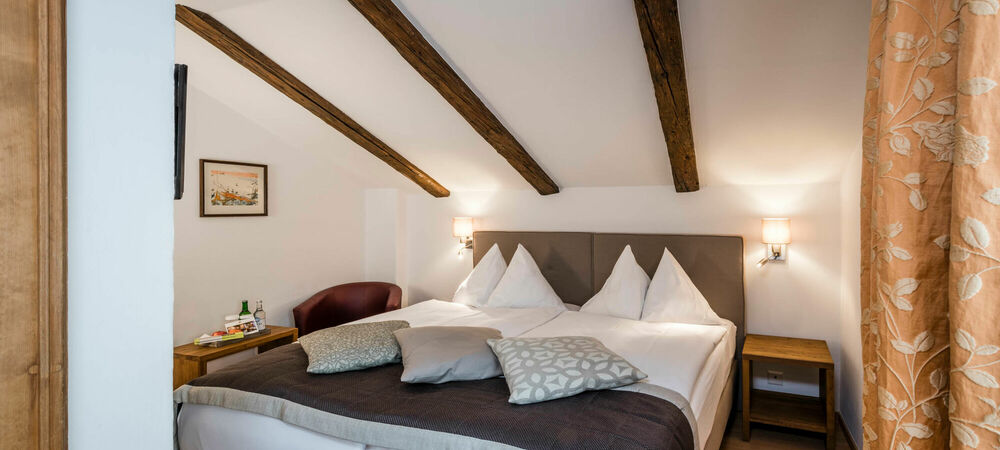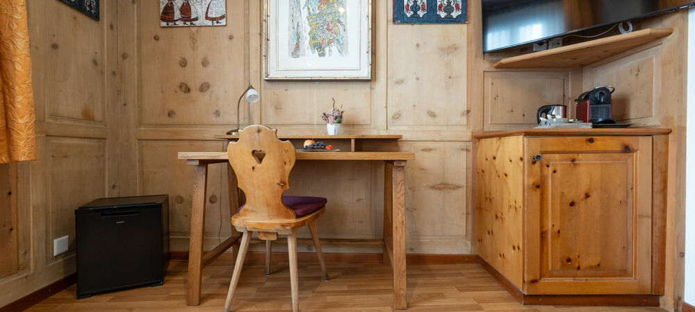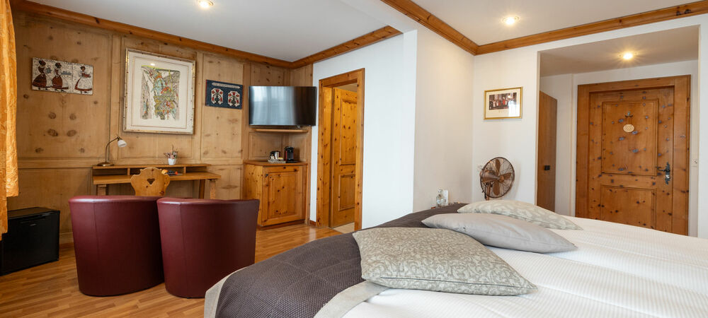 Treten Sie ein in ein feudales Doppelzimmer im typischen Bündnerstil und geniessen Sie die Wohlfühlatmosphäre.